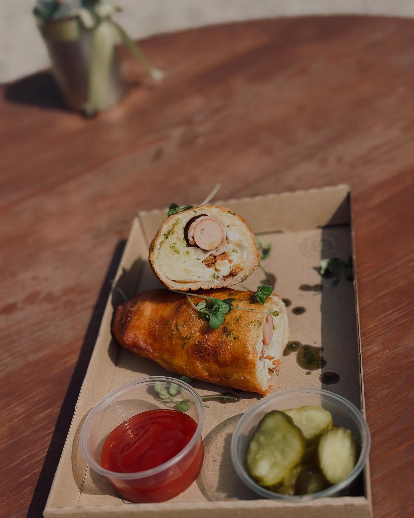bécsi virsli, bacon, pirított hagyma, sajt, ketchup vagy mustár, savanyú uborka